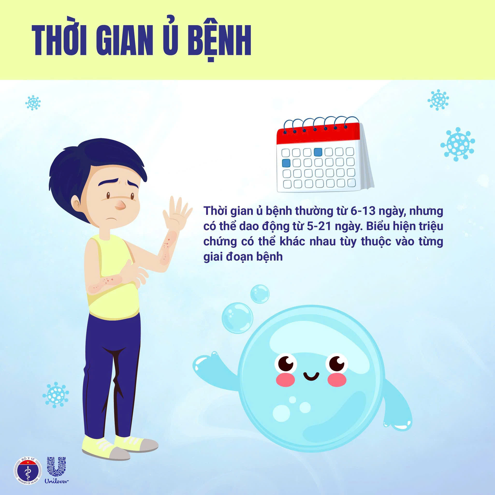 - Thời gian ủ bệnh thường 6–13 ngày, có thể 5–21 ngày.