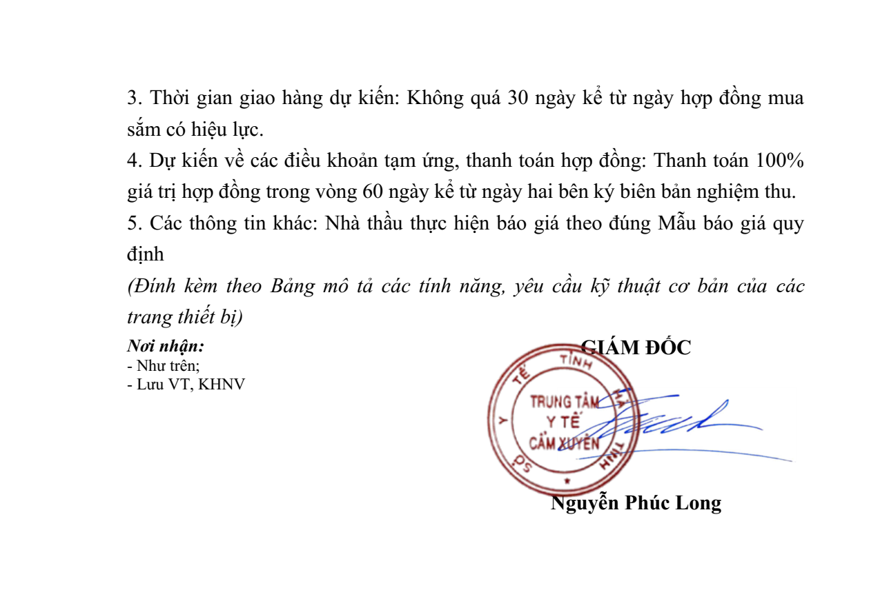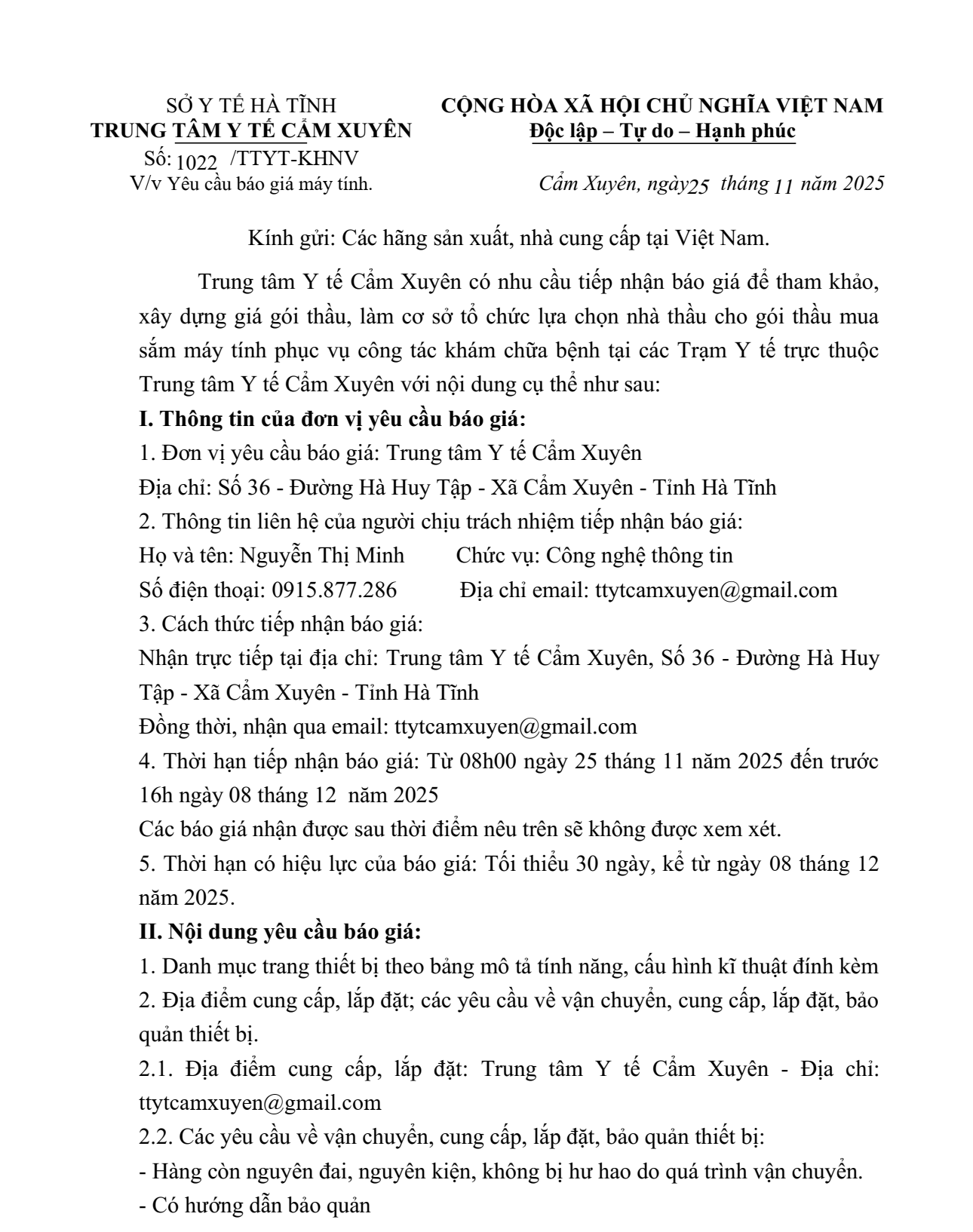 Trung tâm Y tế Cẩm Xuyên có nhu cầu tiếp nhận báo giá để tham khảo, xây dựng giá gói thầu, làm cơ sở tổ chức lựa chọn nhà thầu cho gói thầu mua sắm máy tính phục vụ công tác khám chữa bệnh tại các Trạm Y tế trực thuộc Trung tâm Y tế Cẩm Xuyên với nội dung cụ thể như sau:
