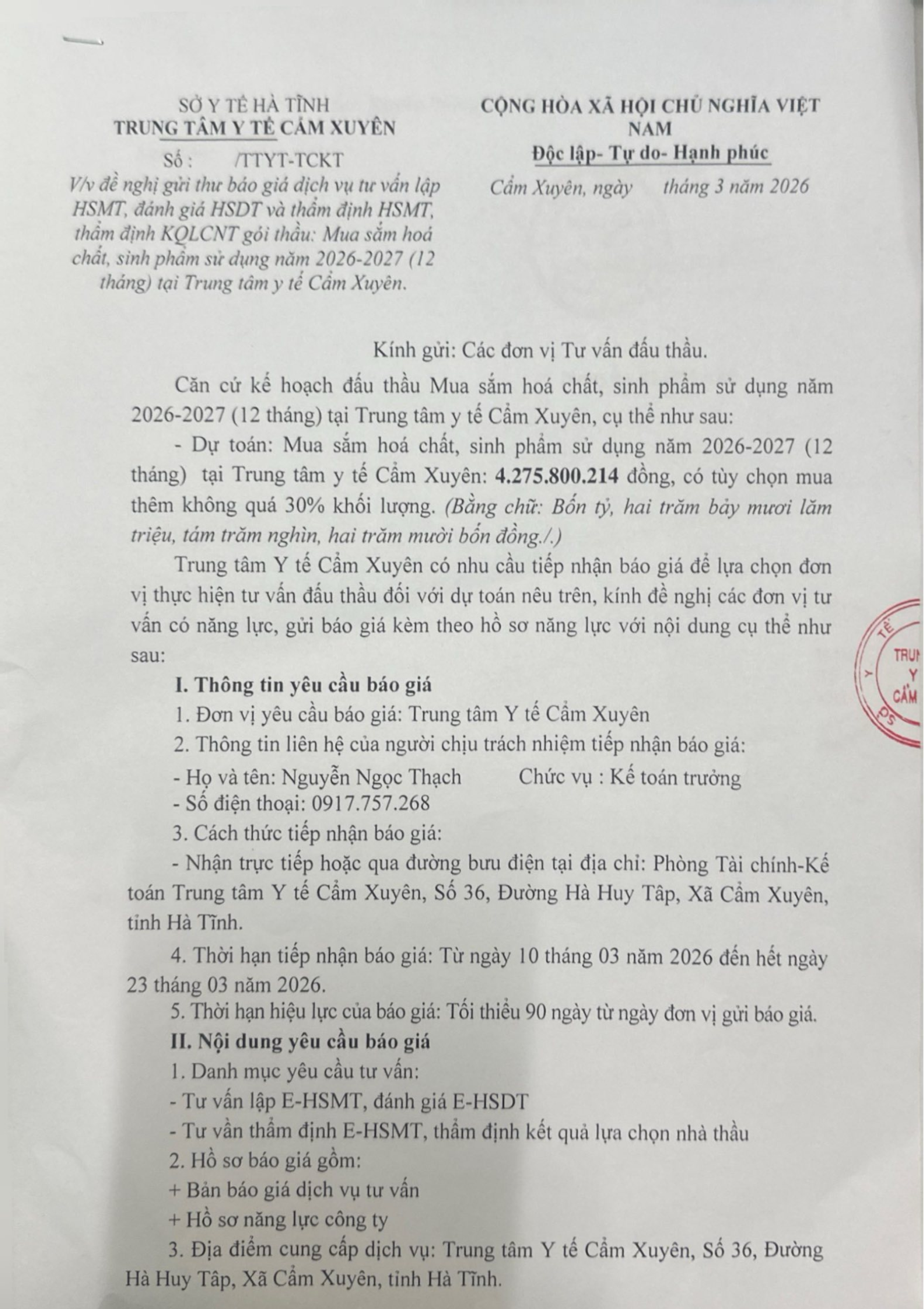 Đề nghị gửi thư báo giá dịch vụ tư vấn lập HSMT, đánh giá HSDT và thẩm định HSMT, thẩm định KQLCNT gói thầu: Mua sắm hoá chất, sinh phẩm sử dụng năm 2026-2027 (12 tháng) tại Trung tâm y tế Cẩm Xuyên.