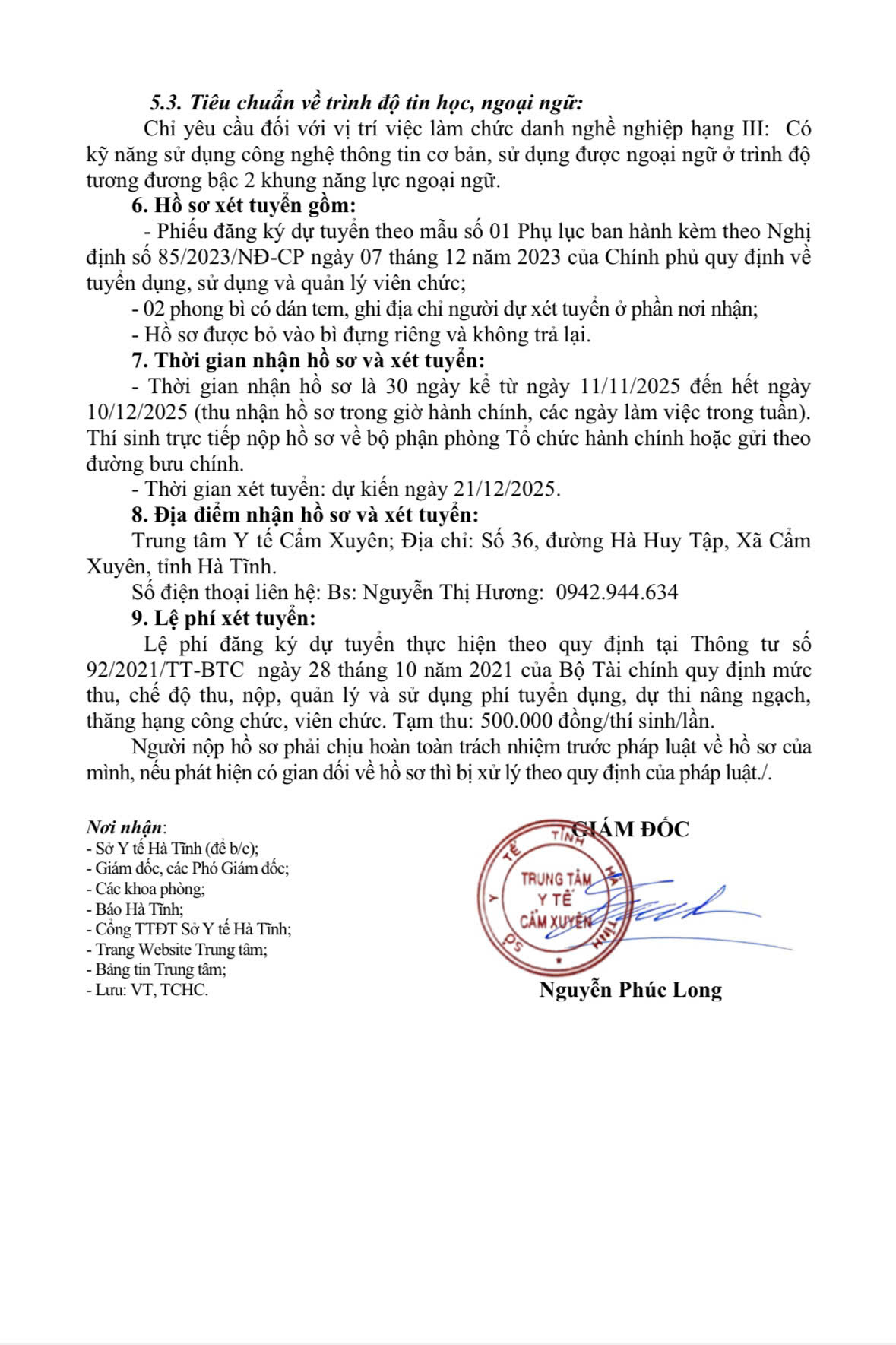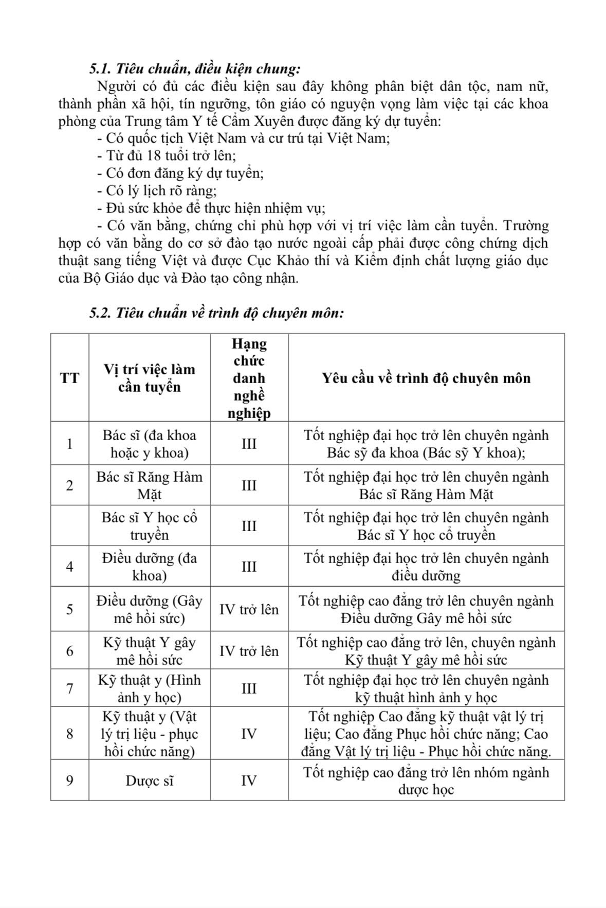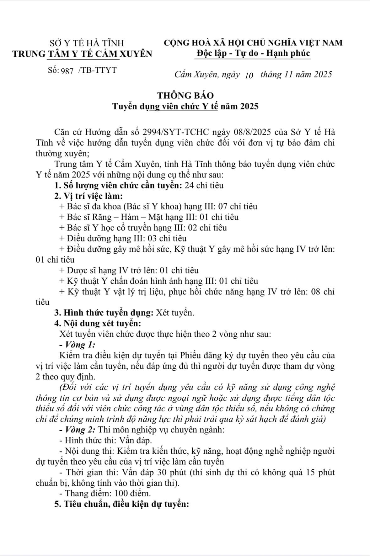 Trung tâm Y tế Cẩm Xuyên thông báo tuyển dụng 24 viên chức y tế năm 2025 với những nội dung cụ thể như sau:
