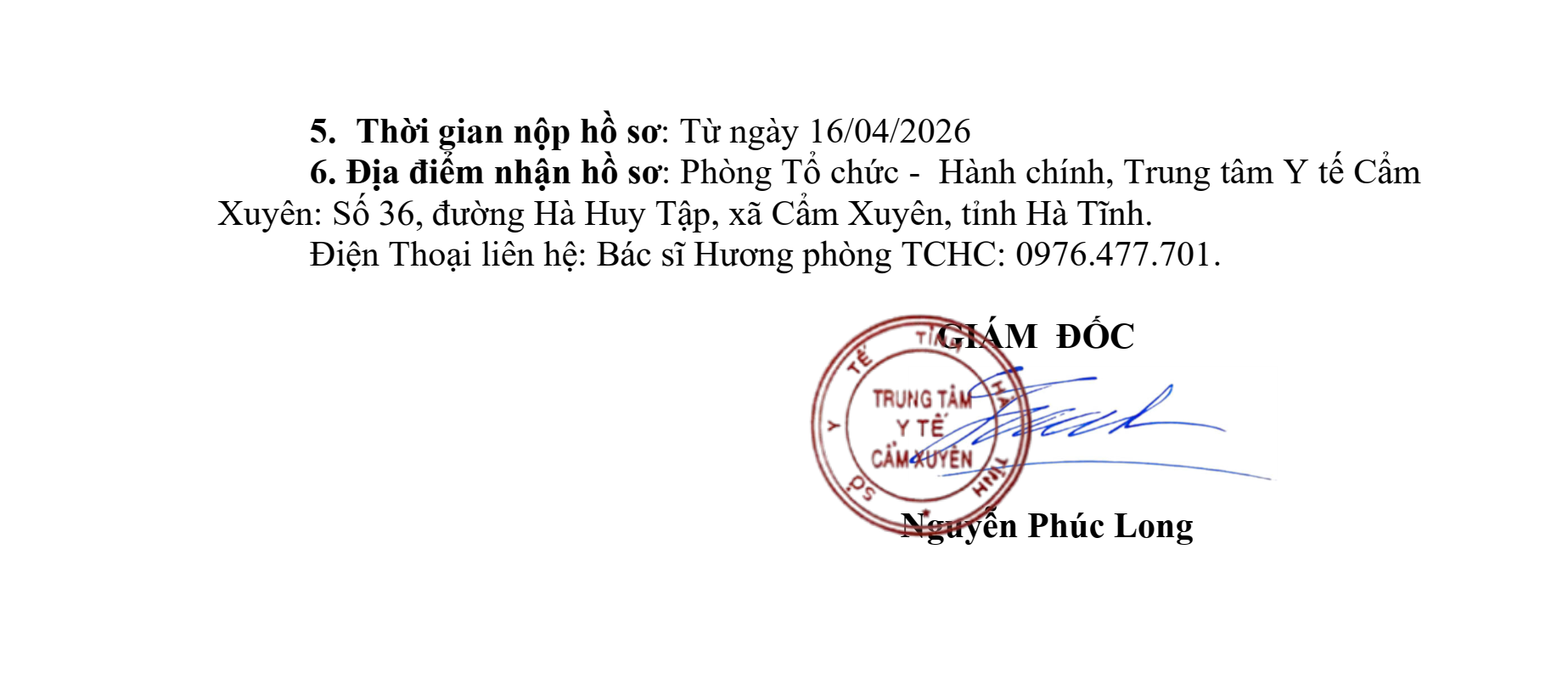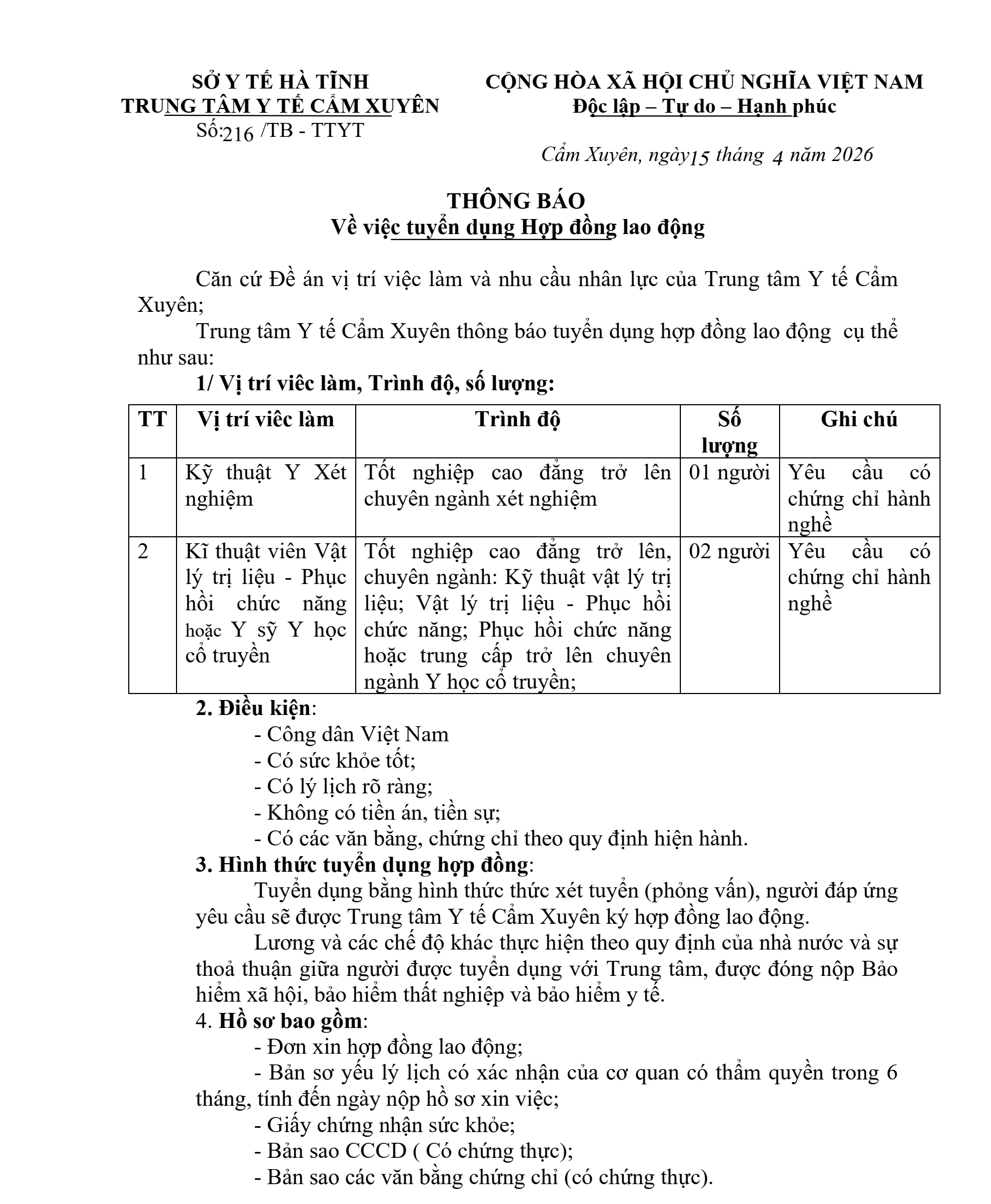 Trung tâm Y tế Cẩm Xuyên thông báo tuyển dụng hợp đồng lao động cụ thể như sau:
