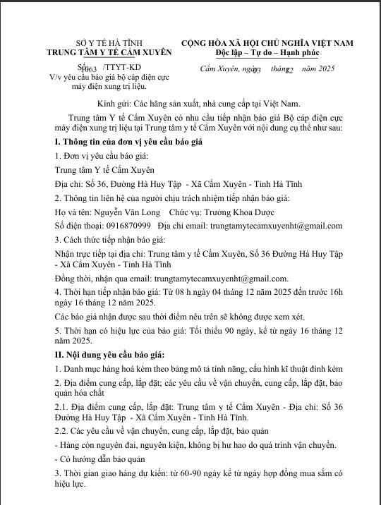 Trung tâm Y tế Cẩm Xuyên có nhu cầu tiếp nhận báo giá Bộ cáp điện cực máy điện xung trị liệu tại Trung tâm y tế Cẩm Xuyên với nội dung cụ thể như sau:
