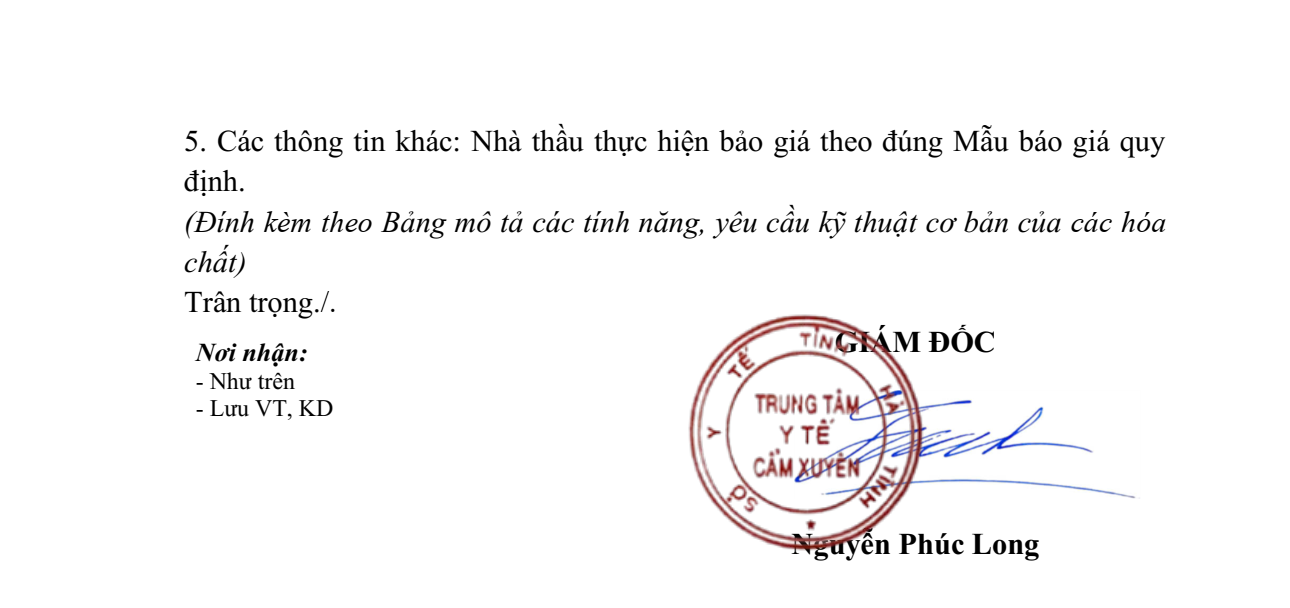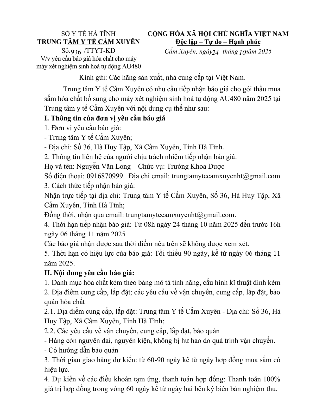 Trung tâm Y tế Cẩm Xuyên có nhu cầu tiếp nhận báo giá cho gói thầu mua sắm hóa chất bổ sung cho máy xét nghiệm sinh hoá tự động AU480 năm 2025 tại Trung tâm y tế Cẩm Xuyên với nội dung cụ thể như sau: