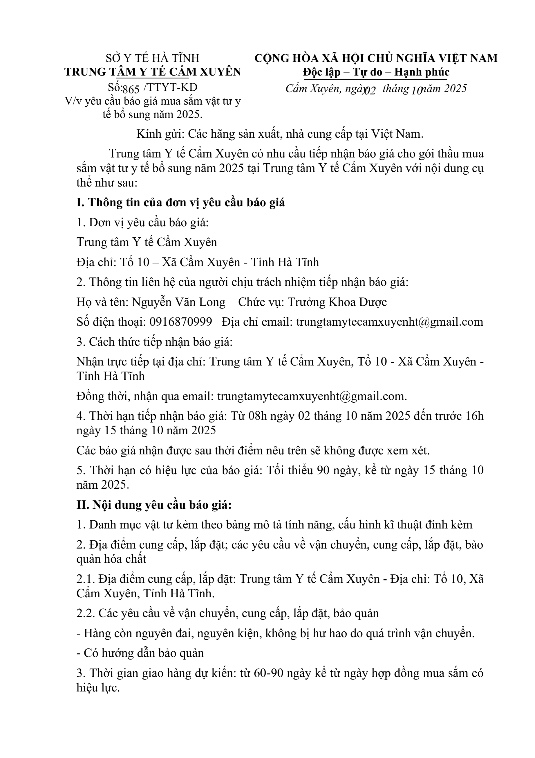 Thư yêu cầu báo giá mua sắm vật tư y tế bổ sung năm 2025