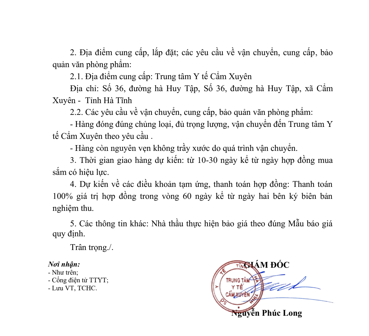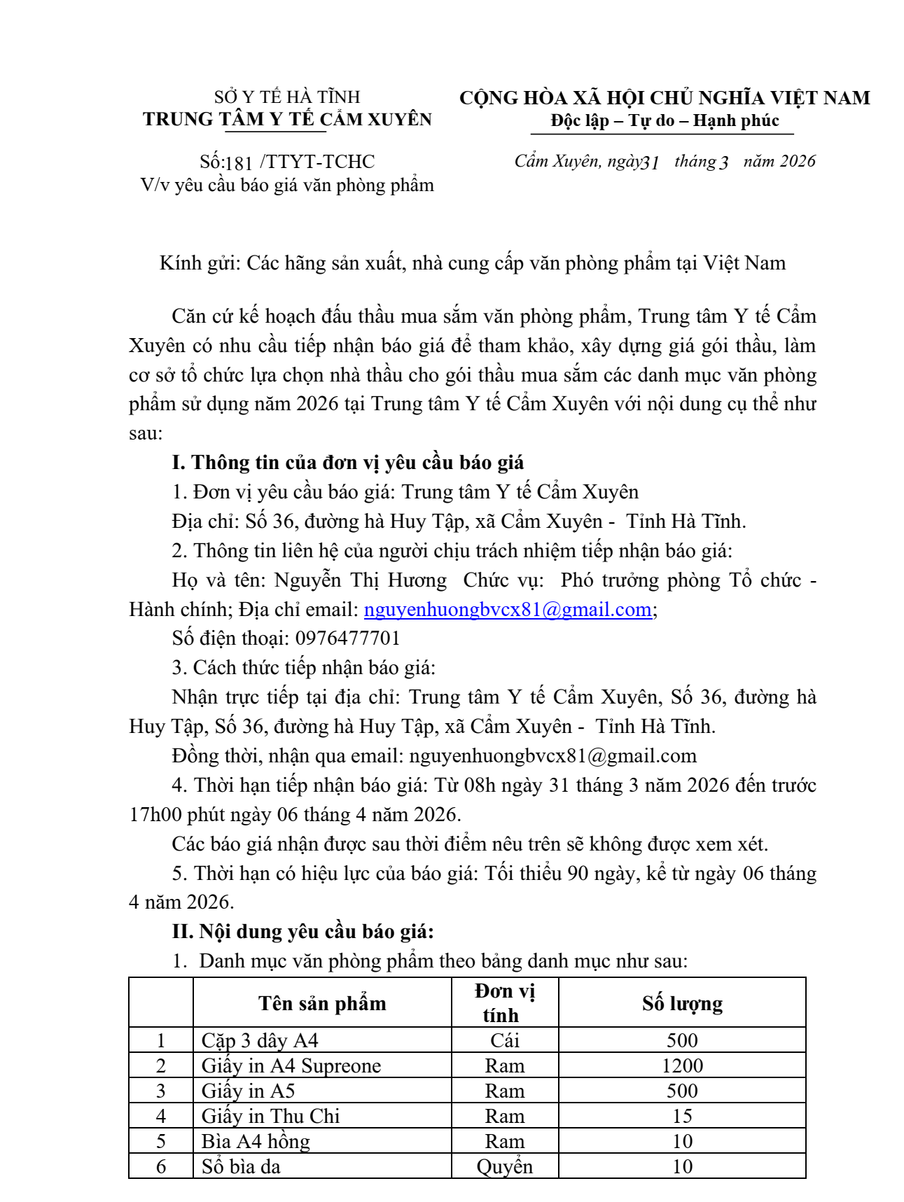 Kính gửi: Các hãng sản xuất, nhà cung cấp văn phòng phẩm tại Việt Nam Căn cứ kế hoạch đấu thầu mua sắm văn phòng phẩm, Trung tâm Y tế Cẩm Xuyên có nhu cầu tiếp nhận báo giá để tham khảo, xây dựng giá gói thầu, làm cơ sở tổ chức lựa chọn nhà thầu cho gói thầu mua sắm các danh mục văn phòng phẩm sử dụng năm 2026 tại Trung tâm Y tế Cẩm Xuyên với nội dung cụ thể như sau: